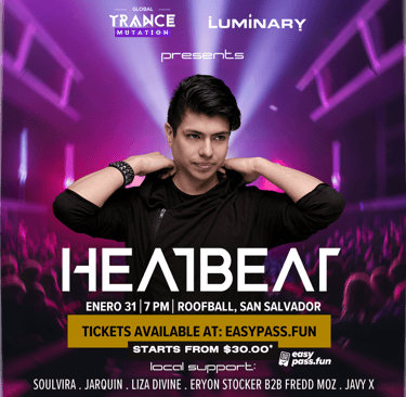 Revive los grandes momentos de la época dorada del Trance en El Salvador junto a HEATBEAT desde Argentina, éste sábado 31 de enero tenemos una cita con LUMINARY y GLOBAL TRANCEMUTATION en el corazón de San Salvador, con una vista espectacular y los mejores DJs / Productores de la casa.